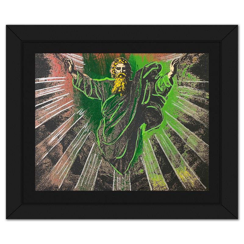 "The Creation" is a hand embellished limited edition silkscreen on canvas by Andy Warhol protege, Steve Kaufman (1960-2010), numbered AP 20/50 inverso and hand signed by the artist. This piece comes custom framed. Includes Letter of Authenticity. Measures approx. 13.5" x 16" (frame), 10.5" x 13" (image). This item requires special handling and may have a longer than usual turnaround.