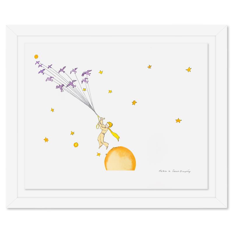 "The Little Prince Flying Away" is a limited edition lithograph by Antoine de Saint-Exupery (1900-1944), bearing the plate signature of the artist. This piece comes from an edition of 300 authorized by the Exupery Estate, but the pieces in this edition are not individually numbered. This piece comes custom framed. Includes Certificate of Authenticity. Measures approx. 25.5" x 21.5" (frame), 19.5" x 15.5" (image).