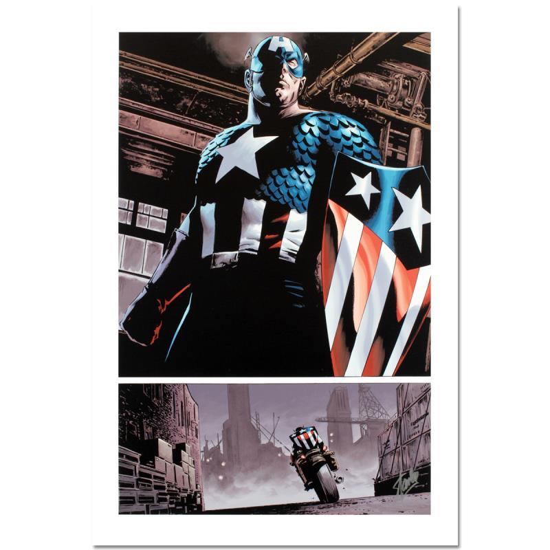 "The Marvels Project #5" is a limited edition giclee on canvas with art by Steve Epting". Officially licensed by Marvel, this piece is from an AP edition and hand signed by creative legend Stan Lee (1922-2018). The piece comes with a certificate of authenticity. Measures approximately 27" x 18".