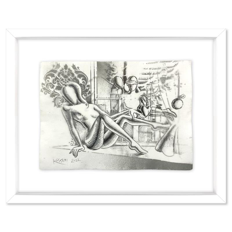"The Muse of Mott Street" is an original drawing on paper by Mark Kostabi, dated 2022 and hand signed by the artist. This piece comes custom framed. Includes Certificate of Authenticity. Measures approx. 19" x 15" (frame), 13.5" x 9.5" (image). The paper is slightly wavy.