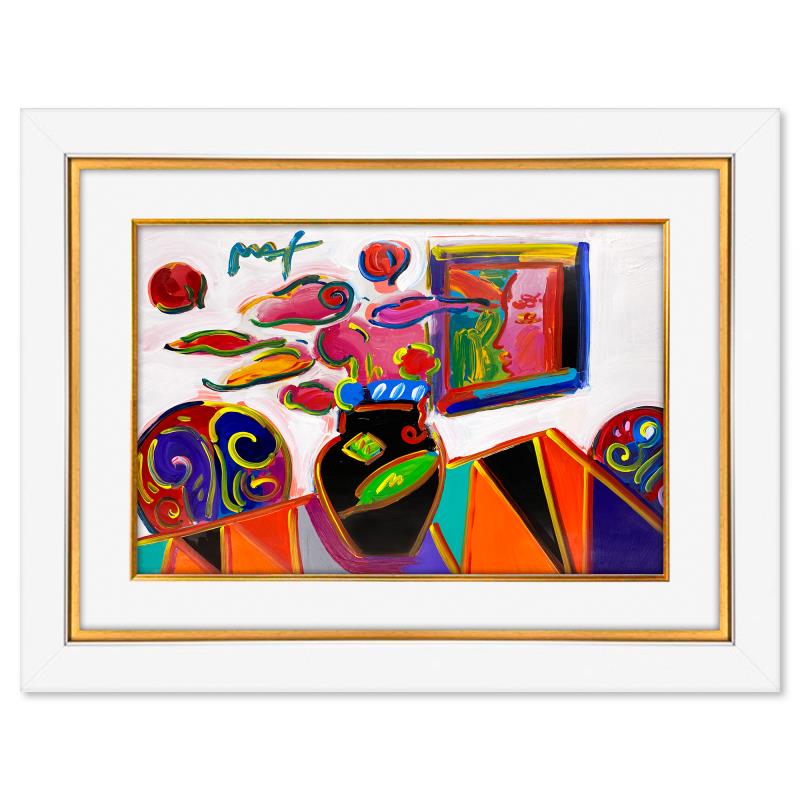 "The Room" is a one-of-a-kind mixed media on paper, hand signed by Peter Max. The piece comes custom framed with a backside cutout to display Peter Max Studio registration number 256621 certifying authenticity. Measures approximately 36" x 48" (frame), 24" x 36" (image). This item requires special handling and may have a longer than usual turnaround.