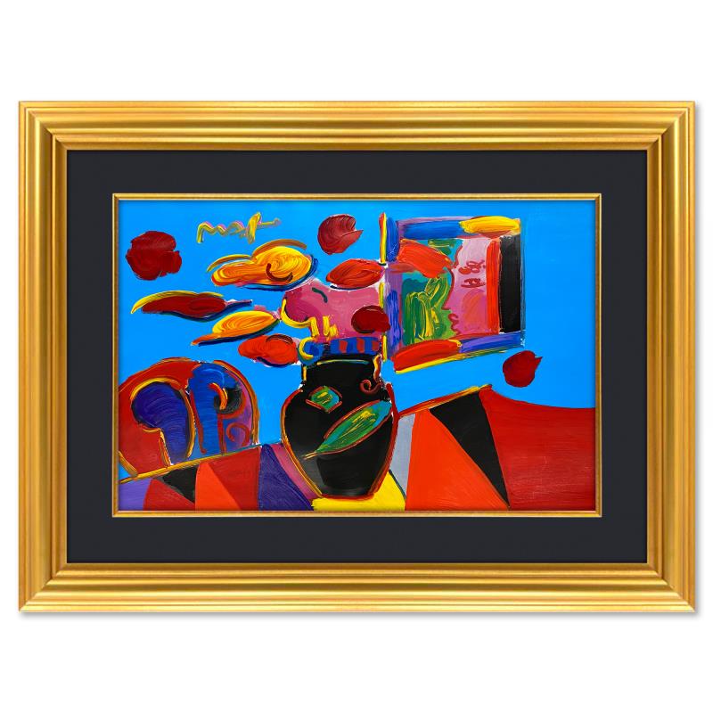 "The Room" is a one-of-a-kind mixed media on paper, hand signed by Peter Max. The piece comes custom framed with a backside cutout to display Peter Max Studio registration number 259362 certifying authenticity. Measures approximately 36" x 48" (frame), 24" x 36" (image). This item requires special handling and may have a longer than usual turnaround.