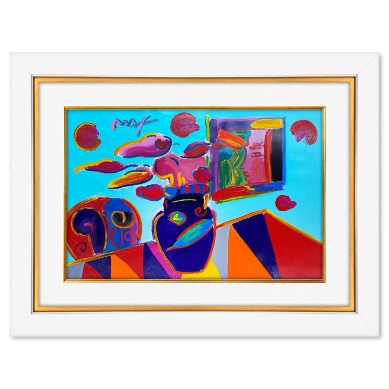 "The Room" is a one-of-a-kind mixed media on paper, hand signed by Peter Max. The piece comes custom framed with a backside cutout to display Peter Max Studio registration number 260460 certifying authenticity. Measures approximately 36" x 48" (frame), 24" x 36" (image). This item requires special handling and may have a longer than usual turnaround.