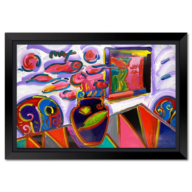 "The Room" is a one-of-a-kind mixed media on paper, hand signed by Peter Max. The piece comes custom framed with a backside cutout to display Peter Max Studio registration number 257178 certifying authenticity. Measures approximately 30" x 42" (frame), 24" x 36" (image). This item requires special handling and may have a longer than usual turnaround.