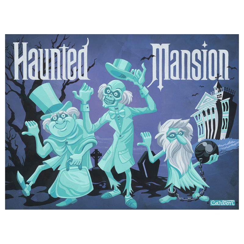 "The Travelers" is a hand embellished limited edition giclee on canvas by Trevor Carlton from Disney Fine Art. Featuring Haunted Mansion imagery, this piece comes numbered, hand signed by the artist, and with a Certificate of Authenticity. Measures approximately 24" x 32" (image).