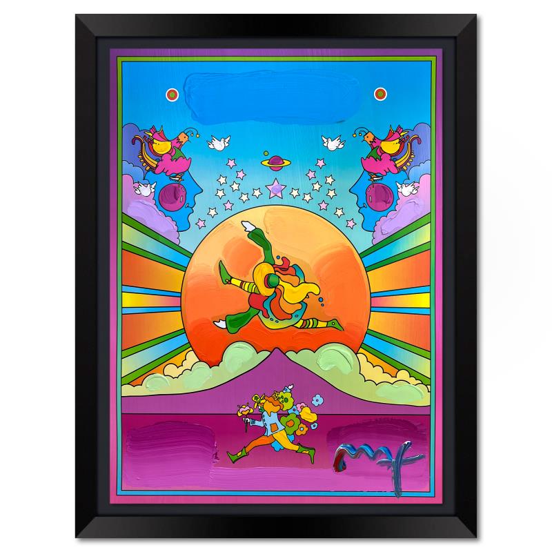 "The Young" is a one-of-a-kind mixed media on paper, hand signed by Peter Max. The piece comes custom framed with a backside cutout to display Peter Max Studio registration number 292266 certifying authenticity. Measures approximately 30" x 24" (frame), 24" x 18" (image). This item requires special handling and may have a longer than usual turnaround.