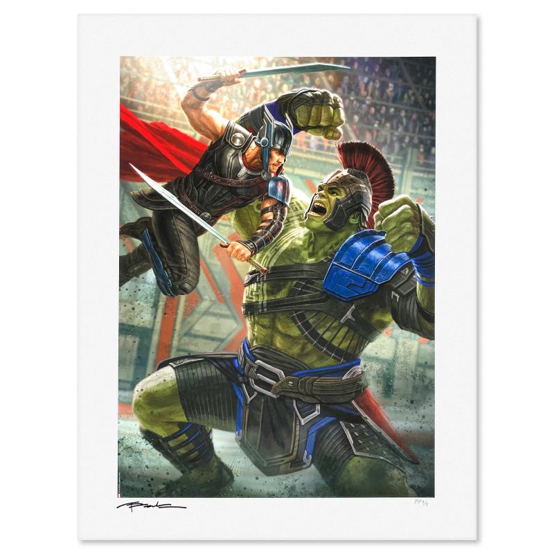 "Thor Ragnarok" is a limited edition giclee on paper from Marvel Comics and Andy Park, PP numbered 3/4 and hand signed by the artist. Includes Letter of Authenticity. Measures approx. 24" x 18" (border) 20" x 14" (image).