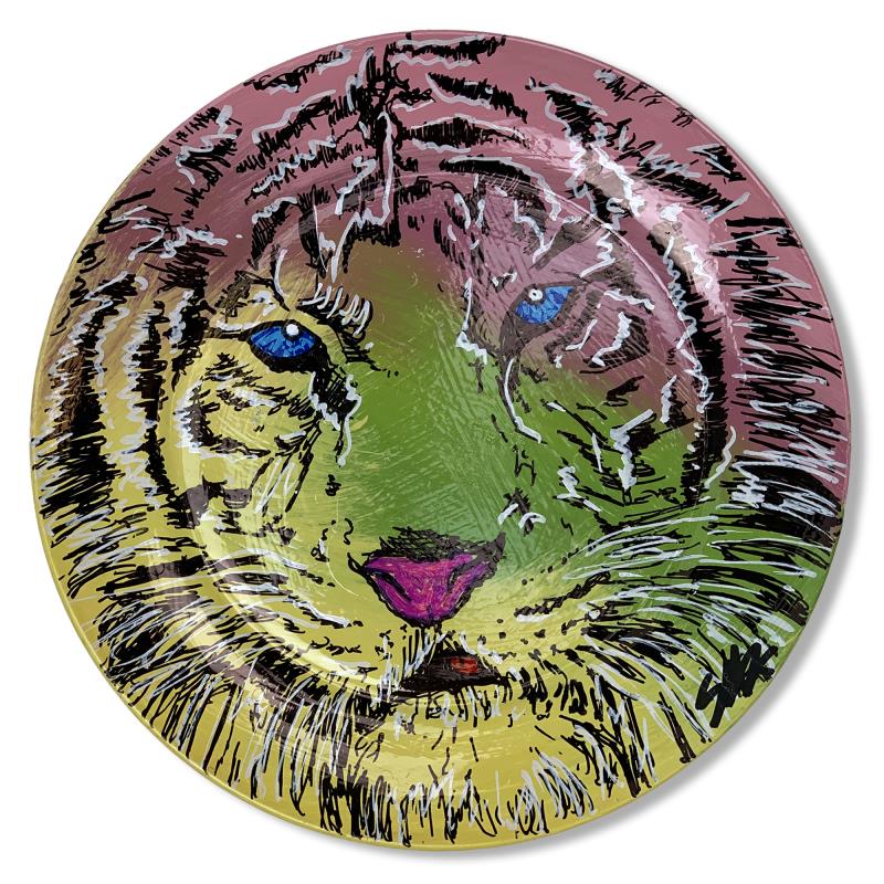 "Tiger" is a hand painted plate by Steve Kaufman (1960-2010). This piece is hand signed by the artist and includes a letter of authenticity. As is common with Kaufman's works, this piece may have perceived minor flaws, but is in overall good condition. Measures approximately 8" (diameter).