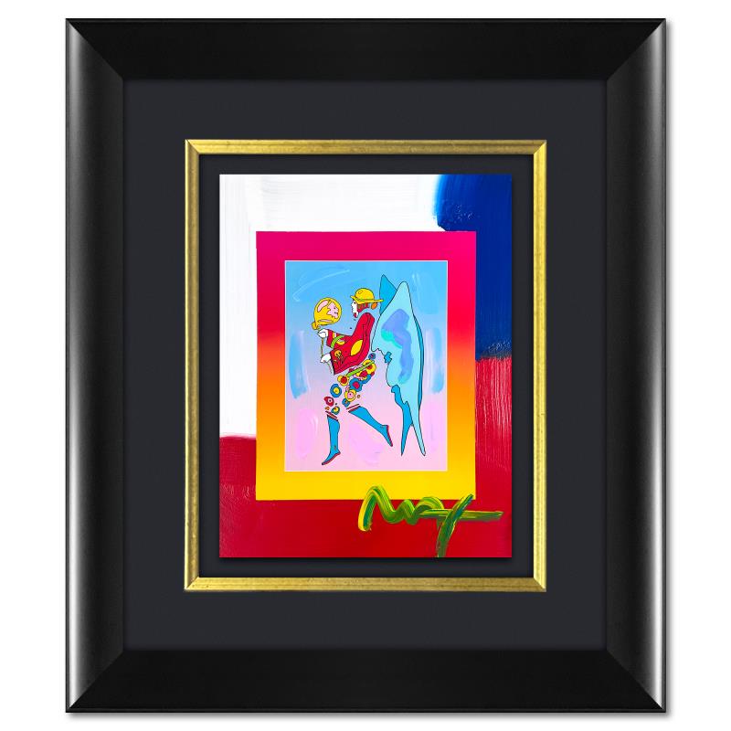 "Tip Toe Floating" is a one-of-a-kind acrylic mixed media on paper, hand signed by Peter Max. The piece comes custom framed with a backside cutout to display Peter Max Studio registration number 268904 certifying authenticity. Measures approx. 30" x 26" (frame), 17" x 13" (image). This item requires special handling and may have a longer than usual turnaround.
