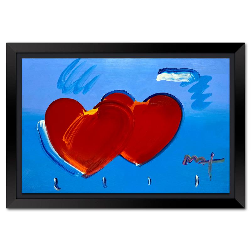 "Two Hearts as One" is a one-of-a-kind mixed media on paper, hand signed by Peter Max. The piece comes custom framed with a backside cutout to display Peter Max Studio registration number 289141 certifying authenticity. Measures approximately 30" x 42" (frame), 24" x 36" (image). This item requires special handling and may have a longer than usual turnaround.