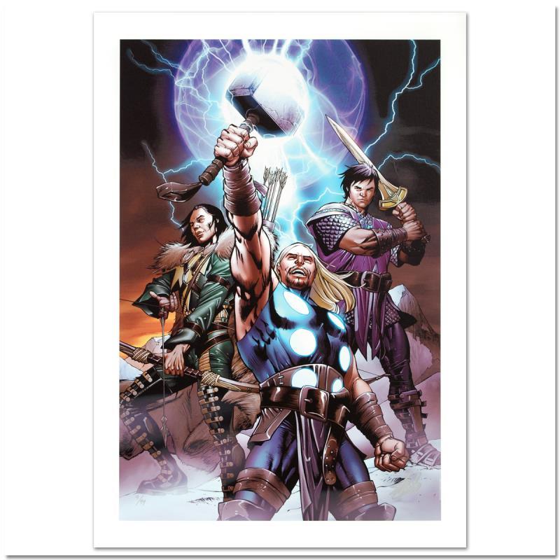 "Ultimate Thor #3" is a limited edition giclee on canvas with art by Carlos Pacheco. Officially licensed by Marvel, this piece is numbered 1/99 and hand signed by creative legend Stan Lee (1922-2018). The piece comes with a certificate of authenticity. Measures approximately 27" x 18".