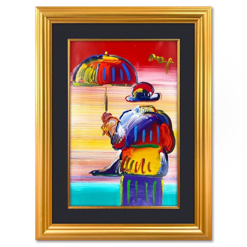 "Umbrella Man" is a one-of-a-kind mixed media on paper, hand signed by Peter Max. The piece comes custom framed with a backside cutout to display Peter Max Studio registration number 315834 certifying authenticity. Measures approximately 44.5" x 36" (frame), 32.5" x 24" (image). This item requires special handling and may have a longer than usual turnaround.