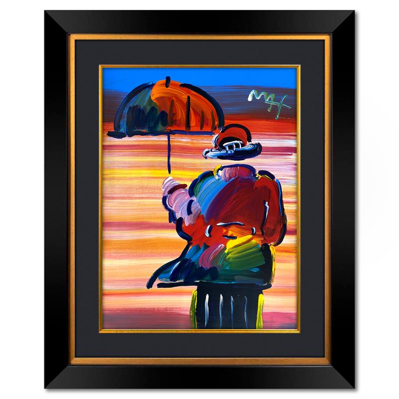 "Umbrella Man" is a one-of-a-kind mixed media on paper, hand signed by Peter Max. The piece comes custom framed with a backside cutout to display Peter Max Studio registration number 180455 certifying authenticity. Measures approximately 44.5" x 36" (frame), 32.5" x 24" (image). This item requires special handling and may have a longer than usual turnaround.