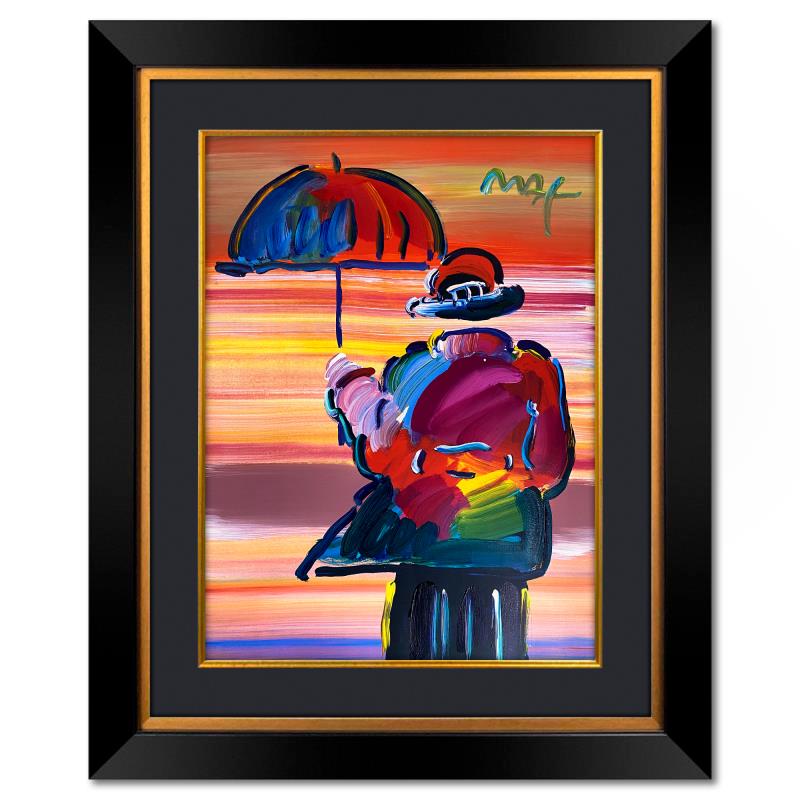 "Umbrella Man" is a one-of-a-kind mixed media on paper, hand signed by Peter Max. The piece comes custom framed with a backside cutout to display Peter Max Studio registration number 176144 certifying authenticity. Measures approximately 44.5" x 36" (frame), 32.5" x 24" (image). This item requires special handling and may have a longer than usual turnaround.