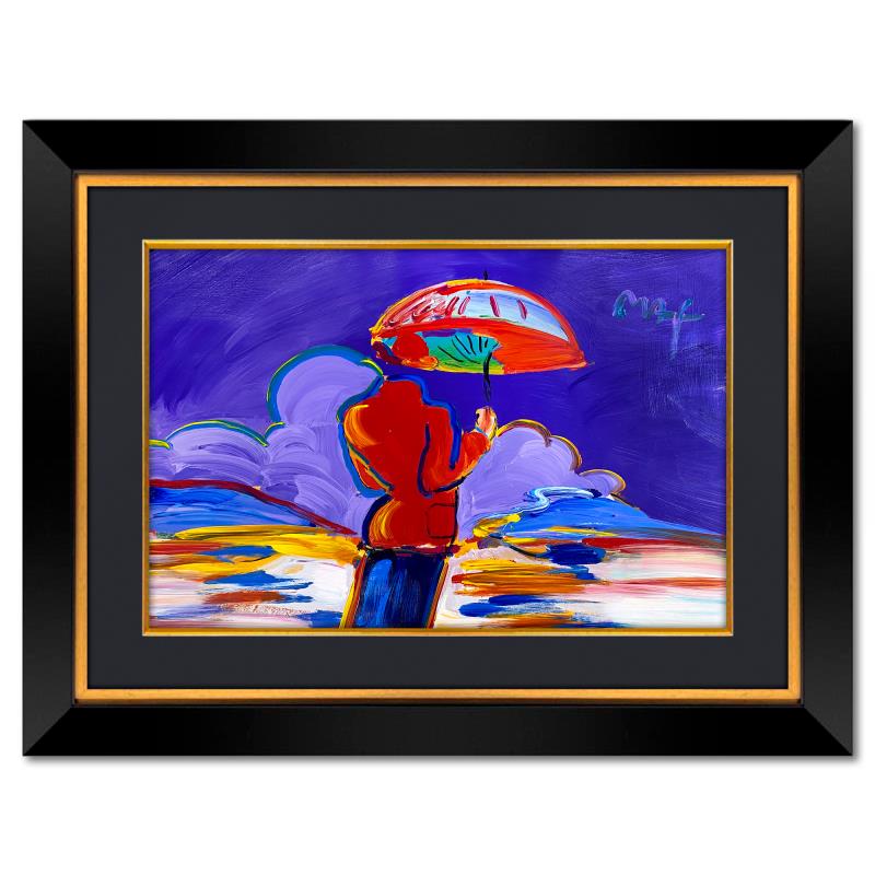 "Umbrella Man at Sea" is a one-of-a-kind mixed media on paper, hand signed by Peter Max. The piece comes custom framed with a backside cutout to display Peter Max Studio registration number 290814 certifying authenticity. Measures approximately 36" x 48" (frame), 24" x 36" (image). This item requires special handling and may have a longer than usual turnaround.