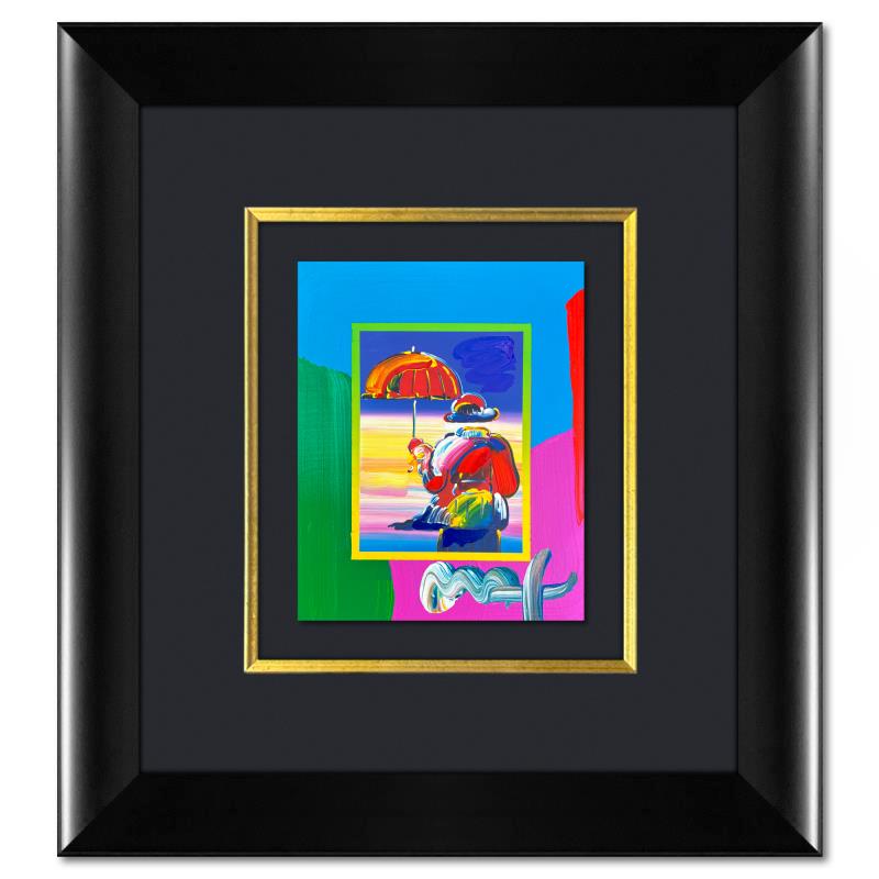 "Umbrella Man on Blends" is a one-of-a-kind acrylic mixed media on paper, hand signed by Peter Max. The piece comes custom framed with a backside cutout to display Peter Max Studio registration number 237739 certifying authenticity. Measures approximately 24" x 22" (frame), 10" x 8" (image). This item requires special handling and may have a longer than usual turnaround.