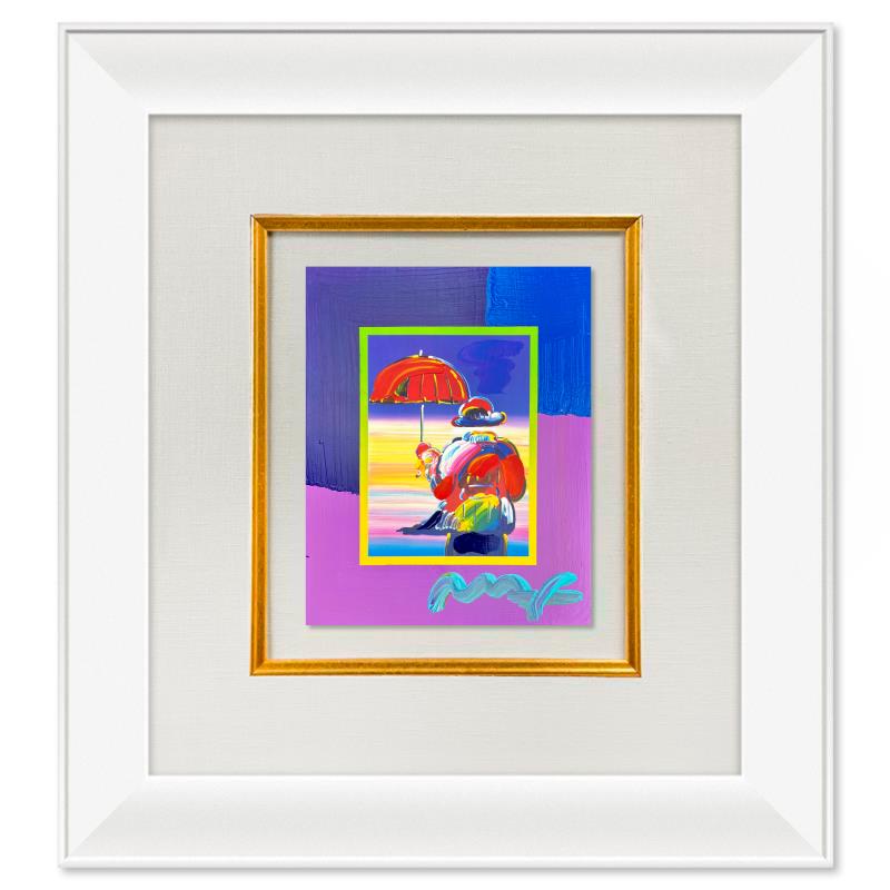 "Umbrella Man on Blends" is a one-of-a-kind acrylic mixed media on paper, hand signed by Peter Max. The piece comes custom framed with a backside cutout to display Peter Max Studio registration number 246131 certifying authenticity. Measures approximately 24" x 22" (frame), 10" x 8" (image). This item requires special handling and may have a longer than usual turnaround.