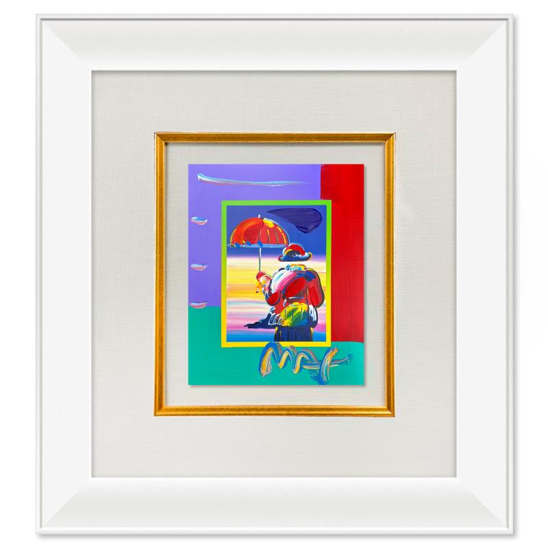 "Umbrella Man on Blends" is a one-of-a-kind acrylic mixed media on paper, hand signed by Peter Max. The piece comes custom framed with a backside cutout to display Peter Max Studio registration number 218122 certifying authenticity. Measures approximately 24" x 22" (frame), 10" x 8" (image). This item requires special handling and may have a longer than usual turnaround.