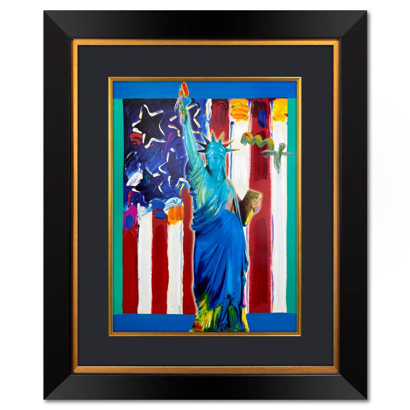 "United We Stand" is a one-of-a-kind mixed media on paper, hand signed by Peter Max. The piece comes custom framed with a backside cutout to display Peter Max Studio registration number 201384 certifying authenticity. Measures approximately 35" x 29" (frame), 24" x 18" (image). This item requires special handling and may have a longer than usual turnaround.