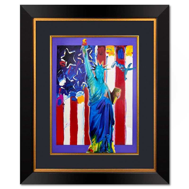 "United We Stand" is a one-of-a-kind mixed media on paper, hand signed by Peter Max. The piece comes custom framed with a backside cutout to display Peter Max Studio registration number 199252 certifying authenticity. Measures approximately 35" x 29" (frame), 24" x 18" (image). This item requires special handling and may have a longer than usual turnaround.