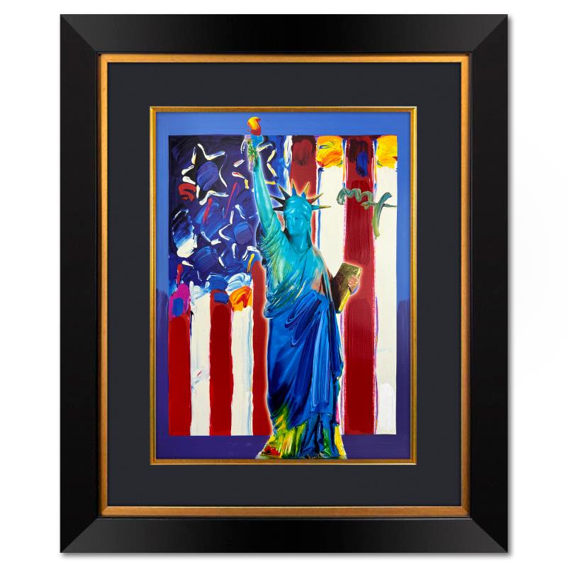 "United We Stand" is a one-of-a-kind mixed media on paper, hand signed by Peter Max. The piece comes custom framed with a backside cutout to display Peter Max Studio registration number 201152 certifying authenticity. Measures approximately 35" x 29" (frame), 24" x 18" (image). This item requires special handling and may have a longer than usual turnaround.