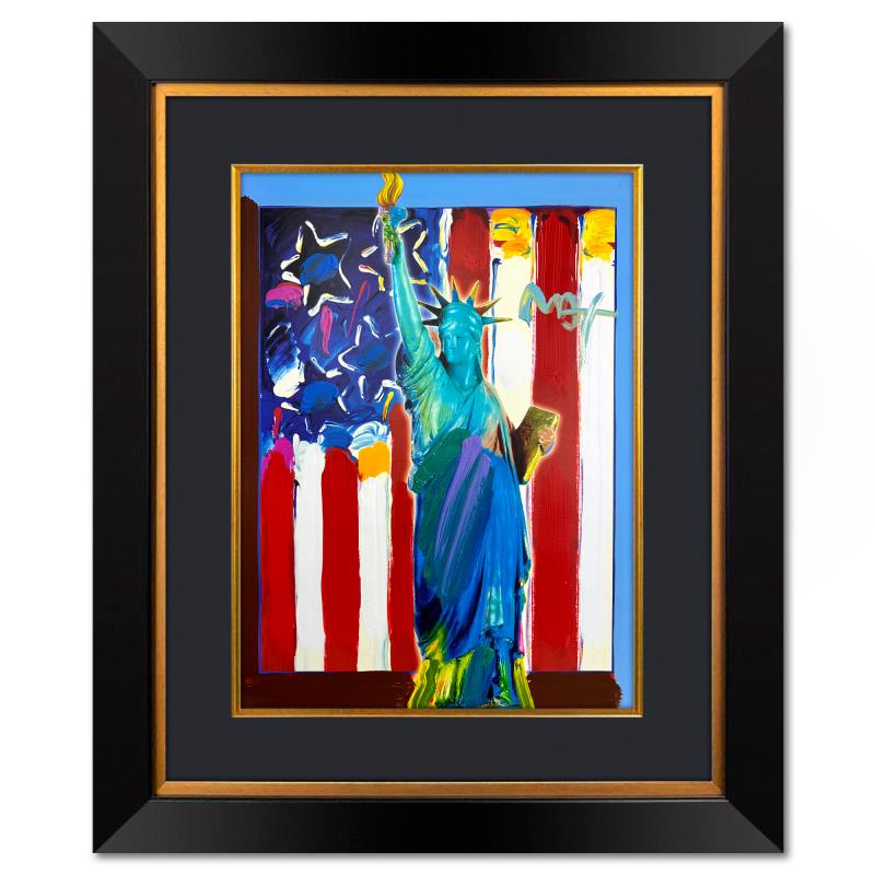 "United We Stand" is a one-of-a-kind mixed media on paper, hand signed by Peter Max. The piece comes custom framed with a backside cutout to display Peter Max Studio registration number 331776 certifying authenticity. Measures approximately 35" x 29" (frame), 24" x 18" (image). This item requires special handling and may have a longer than usual turnaround.