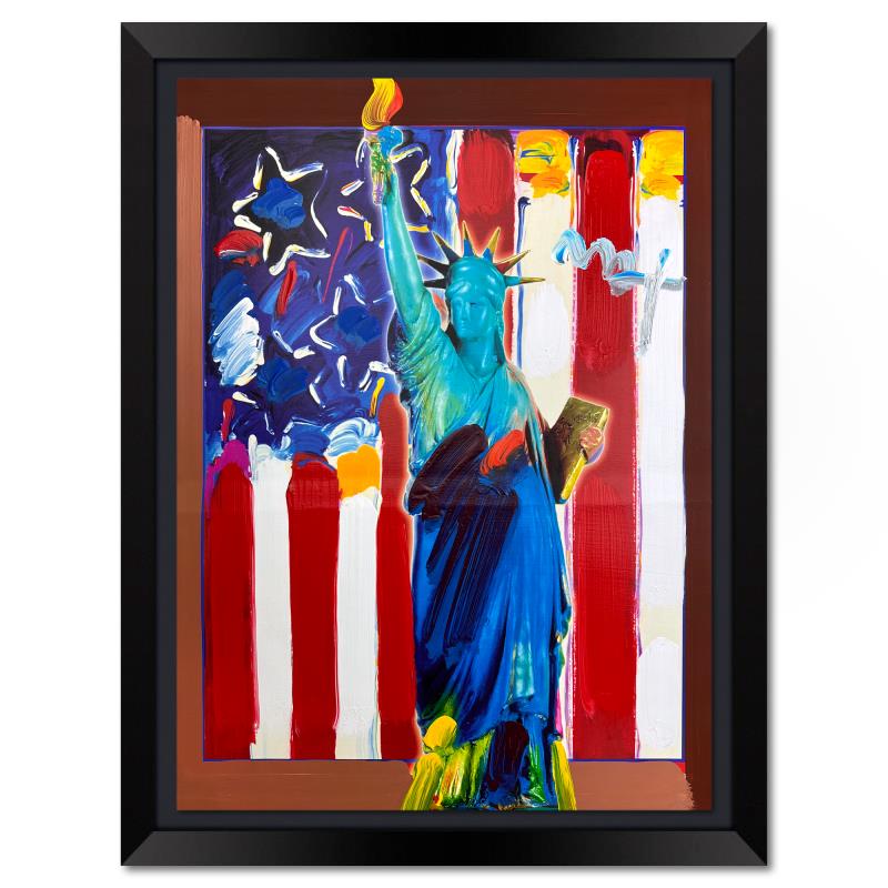 "United We Stand" is a one-of-a-kind mixed media on paper, hand signed by Peter Max. The piece comes custom framed with a backside cutout to display Peter Max Studio registration number 331779 certifying authenticity. Measures approximately 30" x 24" (frame), 24" x 18" (image).