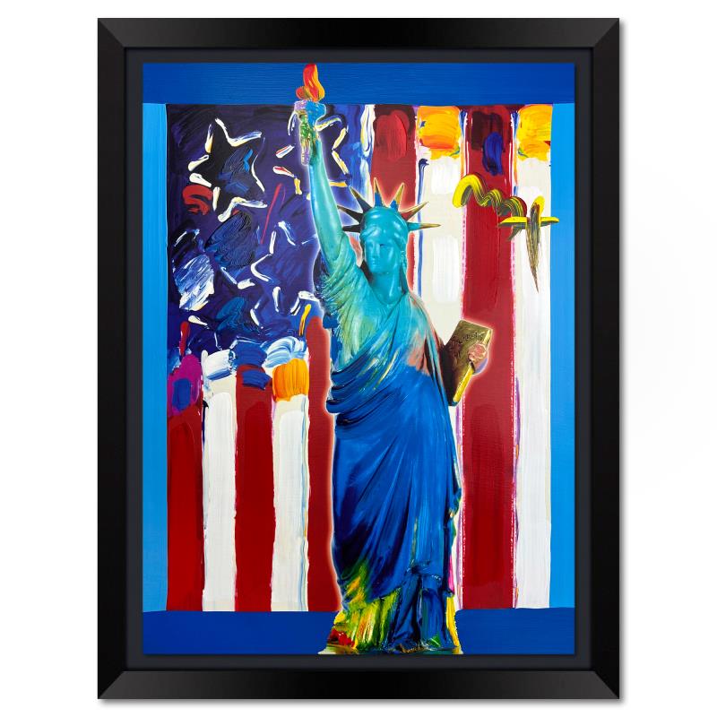 "United We Stand" is a one-of-a-kind mixed media on paper, hand signed by Peter Max. The piece comes custom framed with a backside cutout to display Peter Max Studio registration number 201387 certifying authenticity. Measures approximately 30" x 24" (frame), 24" x 18" (image). This item requires special handling and may have a longer than usual turnaround.