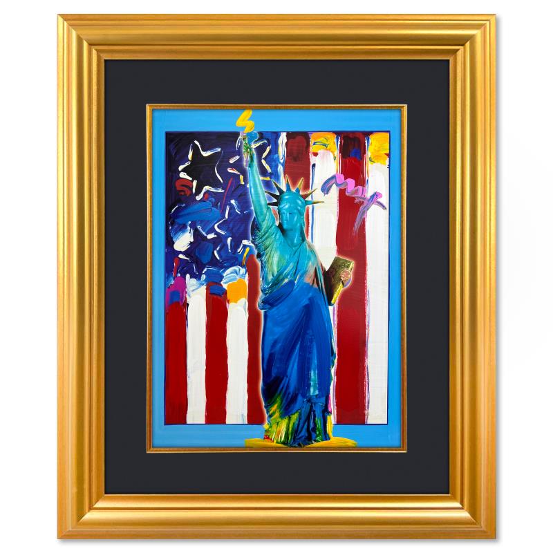 "United We Stand" is a one-of-a-kind mixed media on paper, hand signed by Peter Max. The piece comes custom framed with a backside cutout to display Peter Max Studio registration number 255195 certifying authenticity. Measures approximately 35" x 29" (frame), 24" x 18" (image). This item requires special handling and may have a longer than usual turnaround.