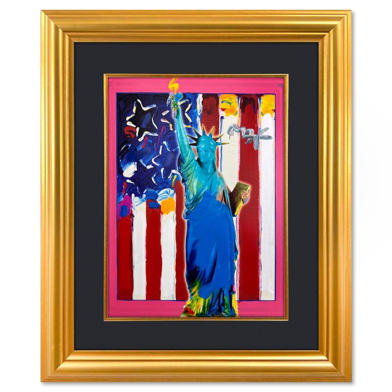 "United We Stand" is a one-of-a-kind mixed media on paper, hand signed by Peter Max. The piece comes custom framed with a backside cutout to display Peter Max Studio registration number 256096 certifying authenticity. Measures approximately 35" x 29" (frame), 24" x 18" (image). This item requires special handling and may have a longer than usual turnaround.
