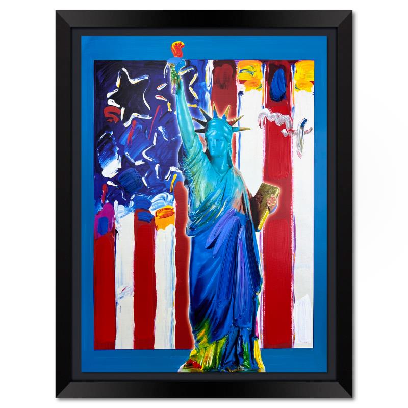 "United We Stand" is a one-of-a-kind mixed media on paper, hand signed by Peter Max. The piece comes custom framed with a backside cutout to display Peter Max Studio registration number 331774 certifying authenticity. Measures approximately 30" x 24" (frame), 24" x 18" (image). This item requires special handling and may have a longer than usual turnaround.