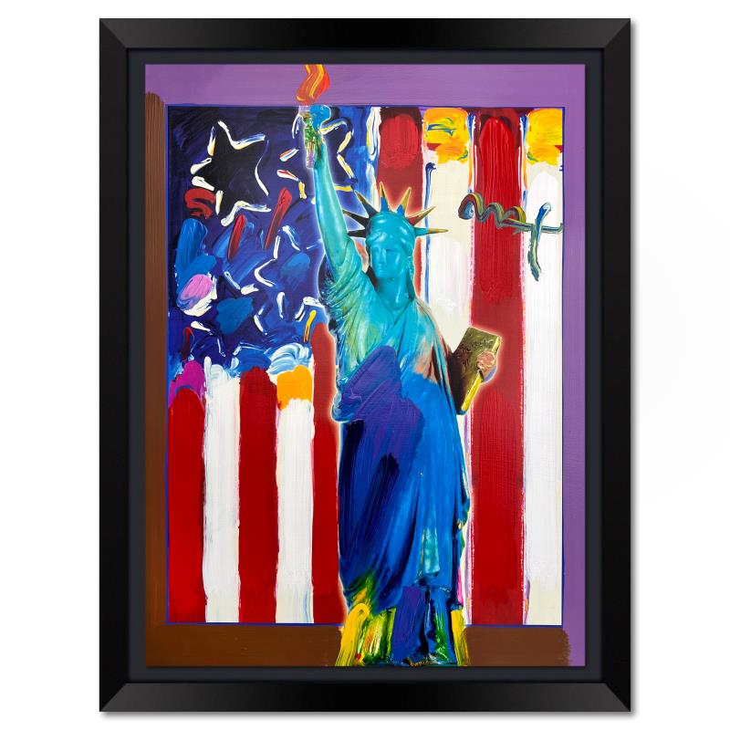 "United We Stand" is a one-of-a-kind mixed media on paper, hand signed by Peter Max. The piece comes custom framed with a backside cutout to display Peter Max Studio registration number 201404 certifying authenticity. Measures approximately 30" x 24" (frame), 24" x 18" (image). This item requires special handling and may have a longer than usual turnaround.