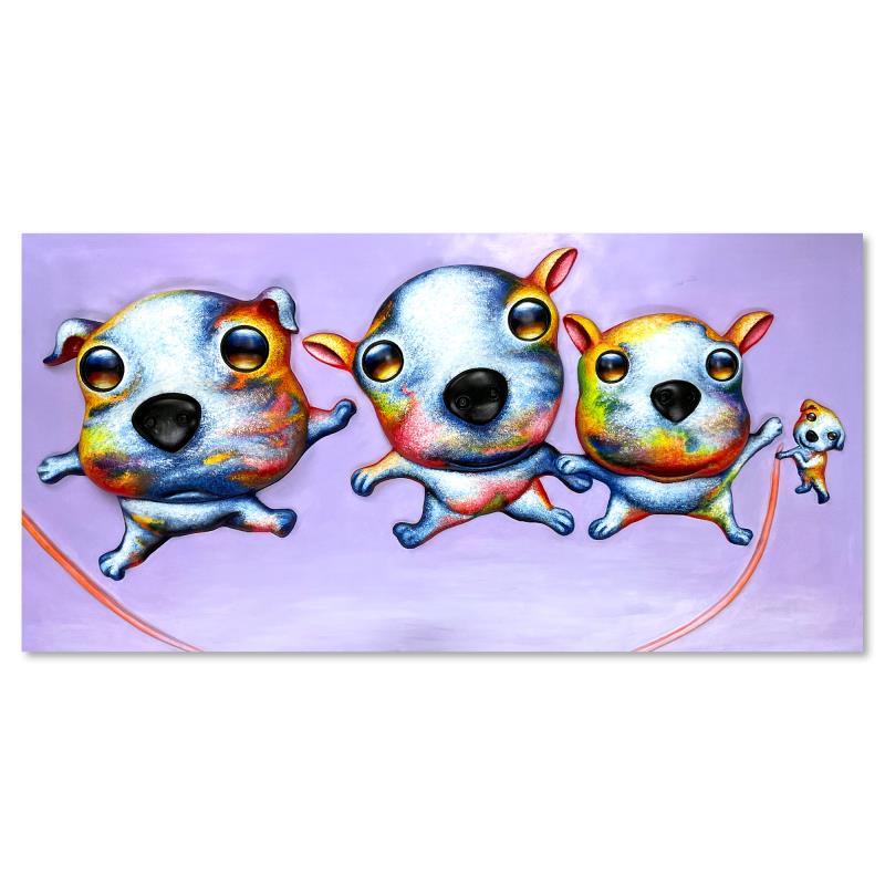 This is a hand painted limited edition dimensional bas relief sculpture by Wang. This piece is numbered 1/3 and hand signed inverso. Includes Letter of Authenticity. Measures approx. 23.5" x 47" x 6". ** Please note: there is some chipping on the corners, edges and particularly the side panels. There is also a faint smudge on the top-right part of the mounting panel (above 3rd dog's head). **