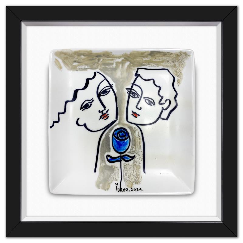 This is a hand painted ceramic plate by Yuroz, hand signed by the artist. This piece comes custom framed floated on linen. Includes Letter of Authenticity. Measures approx. 15.5" x 15.5" (frame), 10" (diameter). This item requires special handling and may have a longer than usual turnaround.