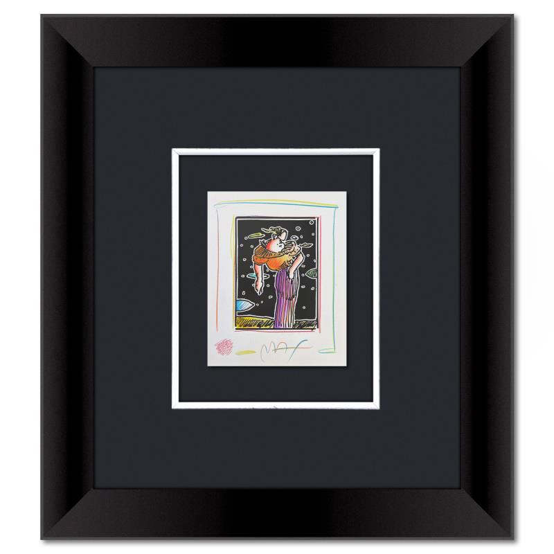 This is a one-of-a-kind mixed media on paper, hand signed by Peter Max. The piece comes custom framed with a backside cutout to display Peter Max Studio registration number 340452 certifying authenticity. Measures approximately 23" x 21" (frame), 9" x 7" (image). This item requires special handling and may have a longer than usual turnaround.