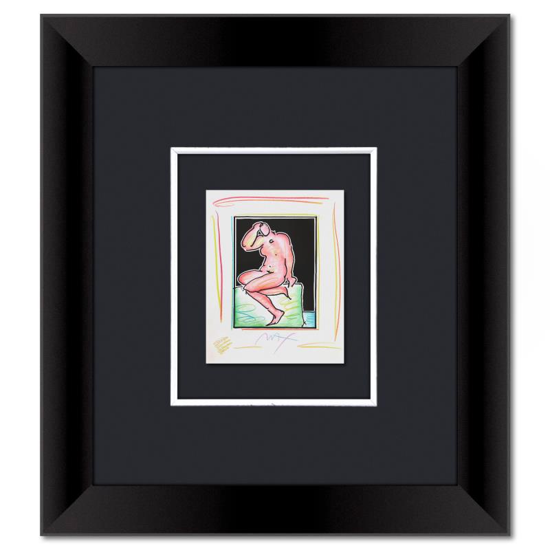 This is a one-of-a-kind mixed media on paper, hand signed by Peter Max. The piece comes custom framed with a backside cutout to display Peter Max Studio registration number 370947 certifying authenticity. Measures approximately 23" x 21" (frame), 9" x 7" (image). This item requires special handling and may have a longer than usual turnaround.