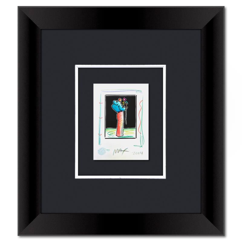 This is a one-of-a-kind mixed media on paper, hand signed by Peter Max. The piece comes custom framed with a backside cutout to display Peter Max Studio registration number 340377 certifying authenticity. Measures approximately 22.5" x 20" (frame), 8.5" x 6" (image). This item requires special handling and may have a longer than usual turnaround.