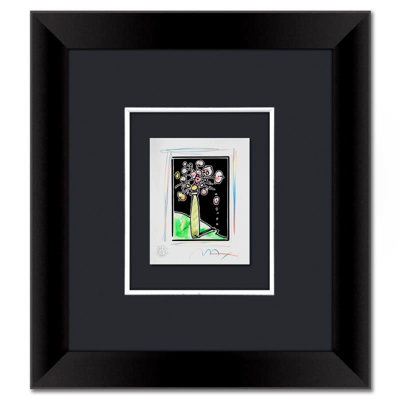 This is a one-of-a-kind mixed media on paper, hand signed by Peter Max. The piece comes custom framed with a backside cutout to display Peter Max Studio registration number 370240 certifying authenticity. Measures approximately 23" x 21" (frame), 9" x 7" (image).