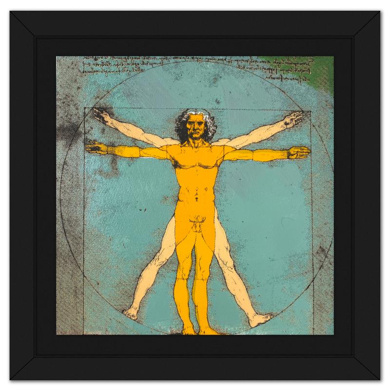 "Vitruvian Man" is a hand embellished limited edition silkscreen on canvas by Andy Warhol protege, Steve Kaufman (1960-2010), numbered 2/50 inverso and hand signed by the artist. This piece comes custom framed. Includes Letter of Authenticity. Measures approx. 16" x 16" (frame), 13" x 13" (image). This item requires special handling and may have a longer than usual turnaround.