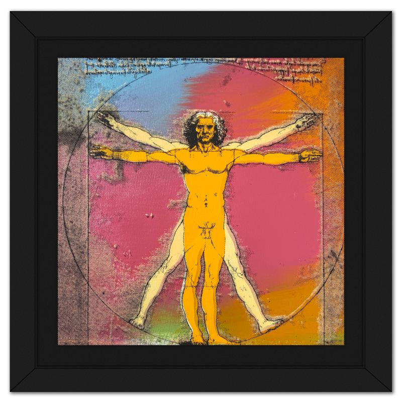"Vitruvian Man" is a hand embellished limited edition silkscreen on canvas by Andy Warhol protege, Steve Kaufman (1960-2010), numbered 12/50 inverso and hand signed by the artist. This piece comes custom framed. Includes Letter of Authenticity. Measures approx. 16" x 16" (frame), 13" x 13" (image). This item requires special handling and may have a longer than usual turnaround.