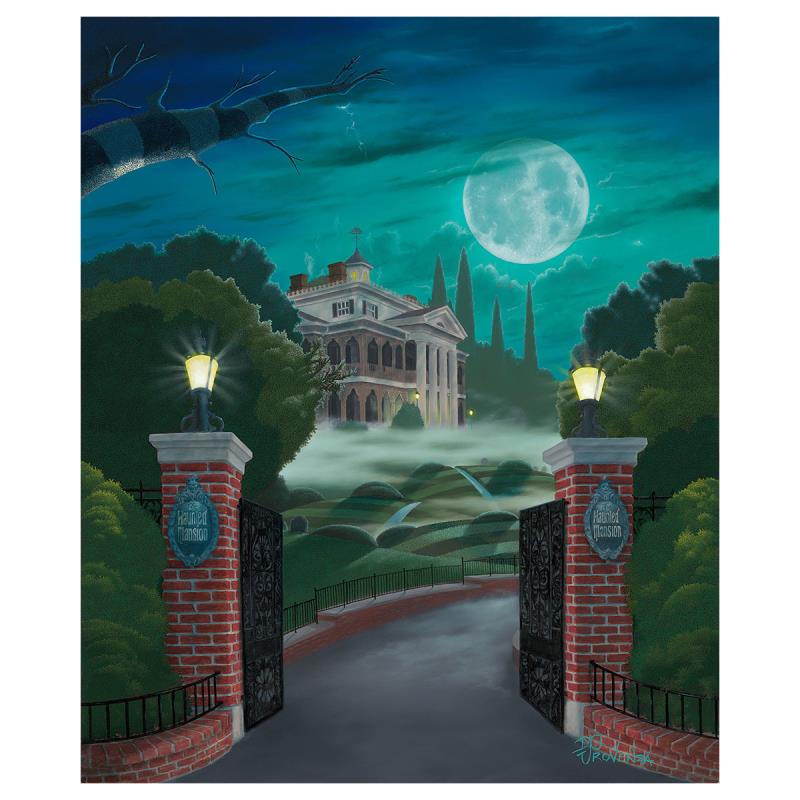 "Welcome to the Haunted Mansion" is a hand embellished limited edition giclee on canvas by Michael Provenza from Disney Fine Art. Featuring Haunted Mansion imagery, this piece comes numbered, hand signed by the artist, and with a Certificate of Authenticity. Measures approximately 24" x 20" (image).