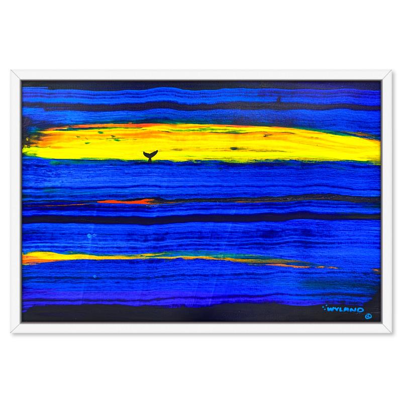 "Whale Tail" is an original acrylic painting on canvas by Wyland, hand signed by the artist. This piece comes custom framed. Includes Letter of Authenticity. Measures approx. 29.5" x 41.5" (frame), 28" x 40" (image). This item requires special handling and may have a longer than usual turnaround.