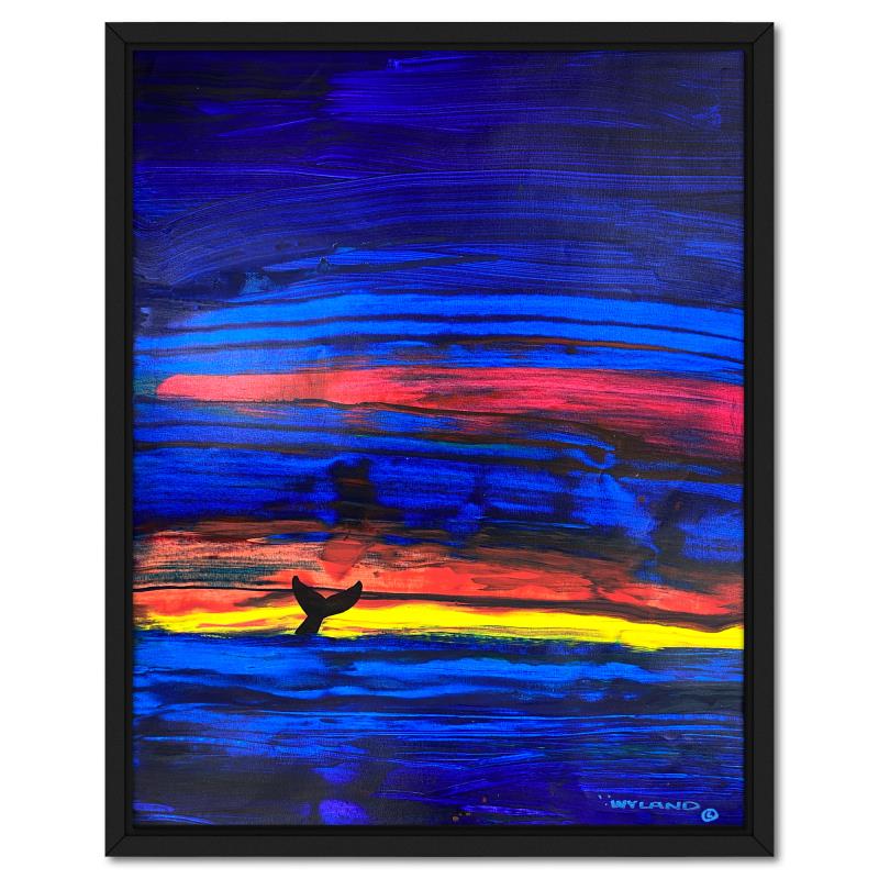 "Whale Tail" is an original acrylic painting on canvas by Wyland, hand signed by the artist. This piece comes custom framed. Includes Letter of Authenticity. Measures approx. 51" x 39" (frame), 48" x 36" (image). This item requires special handling and may have a longer than usual turnaround.