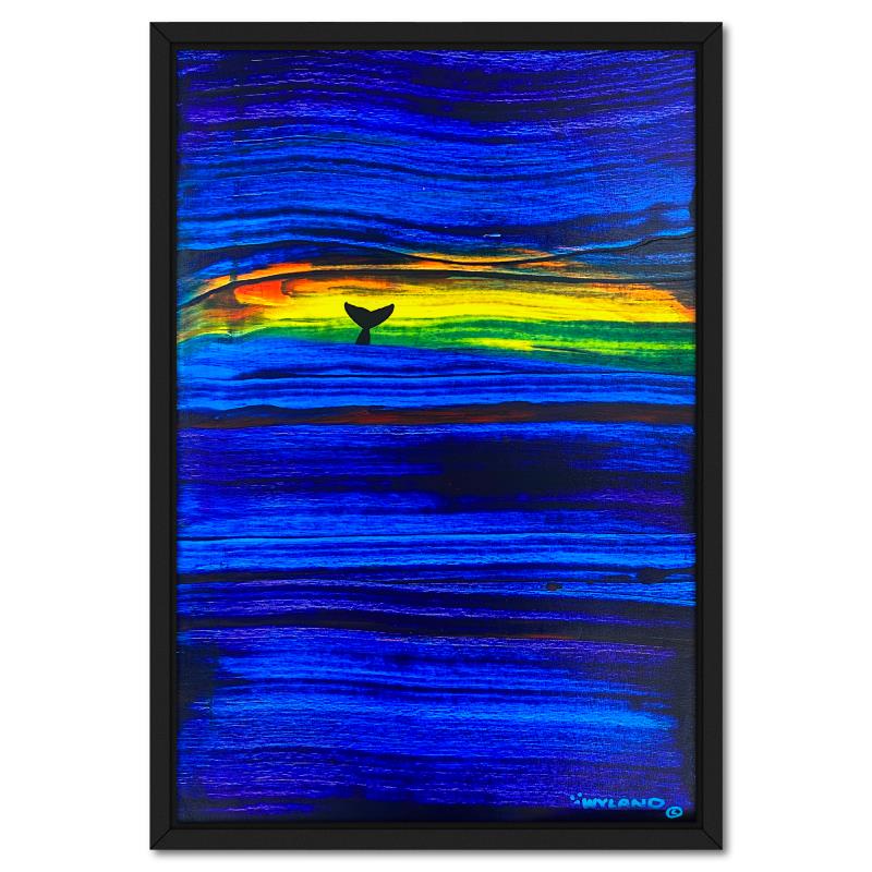 "Whale Tail" is an original acrylic painting on canvas by Wyland, hand signed by the artist. This piece comes custom framed. Includes Letter of Authenticity. Measures approx. 40" x 29.5" (frame), 38.5" x 28" (image). This item requires special handling and may have a longer than usual turnaround.