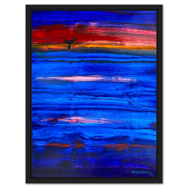 "Whale Tail" is an original acrylic painting on canvas by Wyland, hand signed by the artist. This piece comes custom framed. Includes Letter of Authenticity. Measures approx. 51" x 39" (frame), 48" x 36" (image). This item requires special handling and may have a longer than usual turnaround.