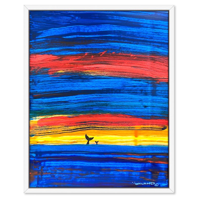 "Whale Tails"is an original acrylic painting on canvas by Wyland, hand signed by the artist. This piece comes custom framed. Includes Letter of Authenticity. Measures approx. 40" x 33" (frame), 37" x 30" (image). This item requires special handling and may have a longer than usual turnaround.