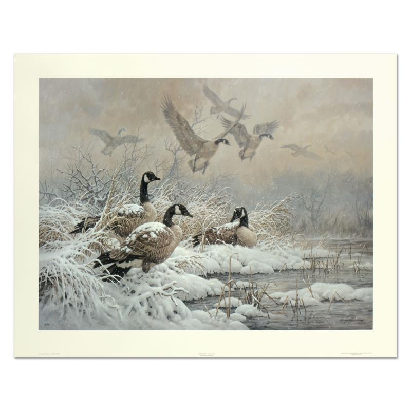 "Winter Retreat - Canada Geese" is a limited edition lithograph on paper by Larry Fanning (1938-2014), numbered and hand signed with a Letter of Authenticity. Measures approximately 30" x 22.5" (image).