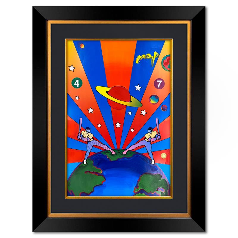 "World Series 2000" is a one-of-a-kind mixed media on paper, hand signed by Peter Max. The piece comes custom framed with a backside cutout to display Peter Max Studio registration number 297204 certifying authenticity. Measures approximately 48" x 36" (frame), 36" x 24" (image). This item requires special handling and may have a longer than usual turnaround.